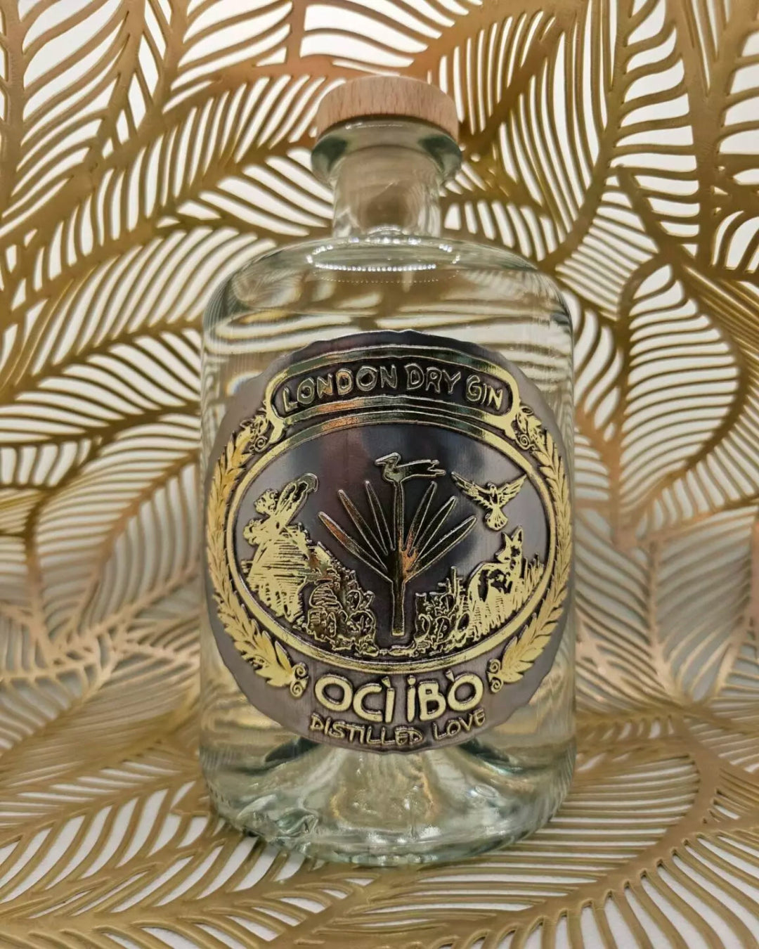 Gin Ocì Ibò ha un'etichetta, realizzata in metallo pregiato, che evoca il connubio tra lusso e spiritualità: al centro il simbolo di Ossaim, Signore delle Foglie, guardiano delle conoscenze ancestrali relative alla natura e alle capacità curative delle erbe.